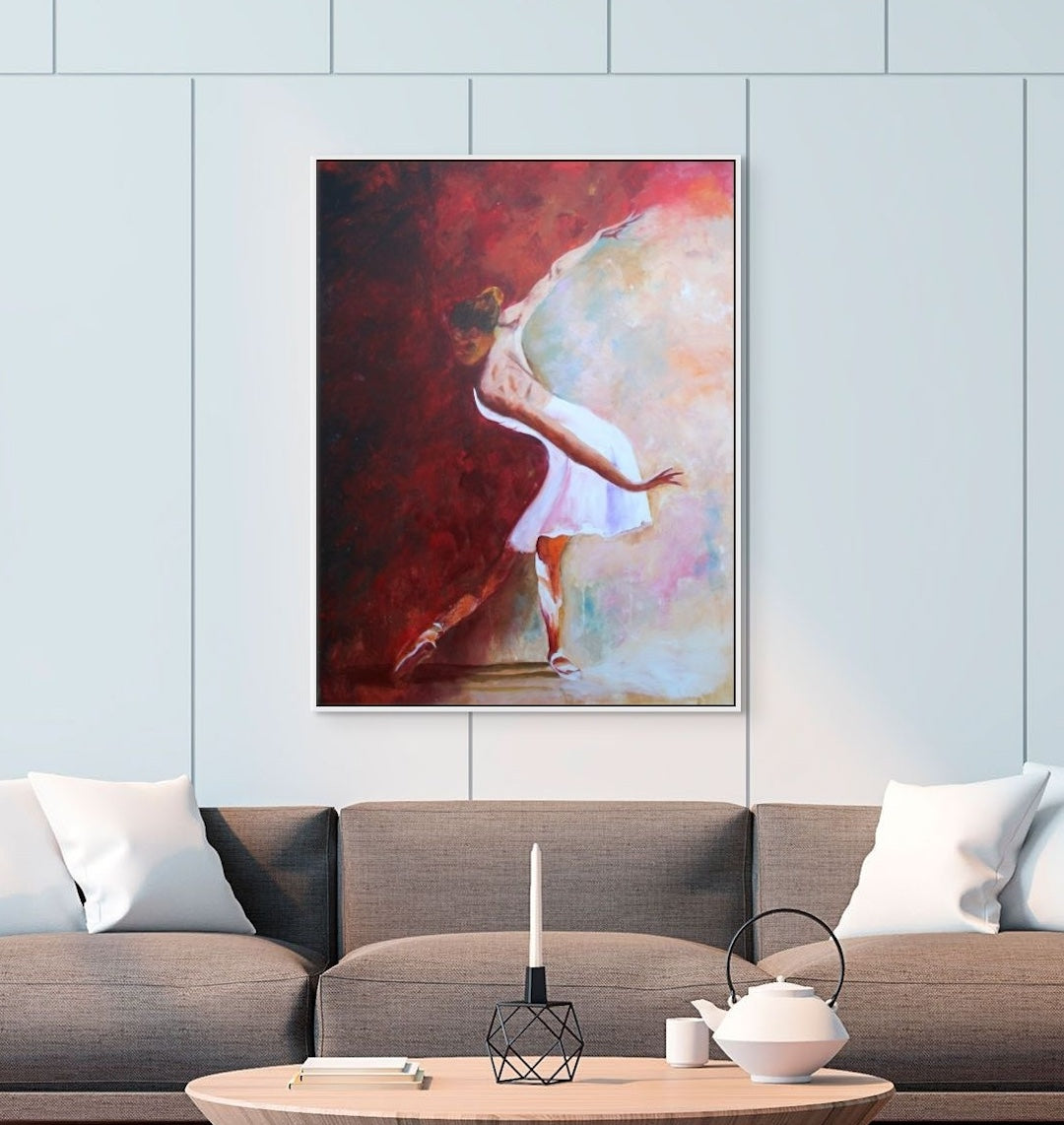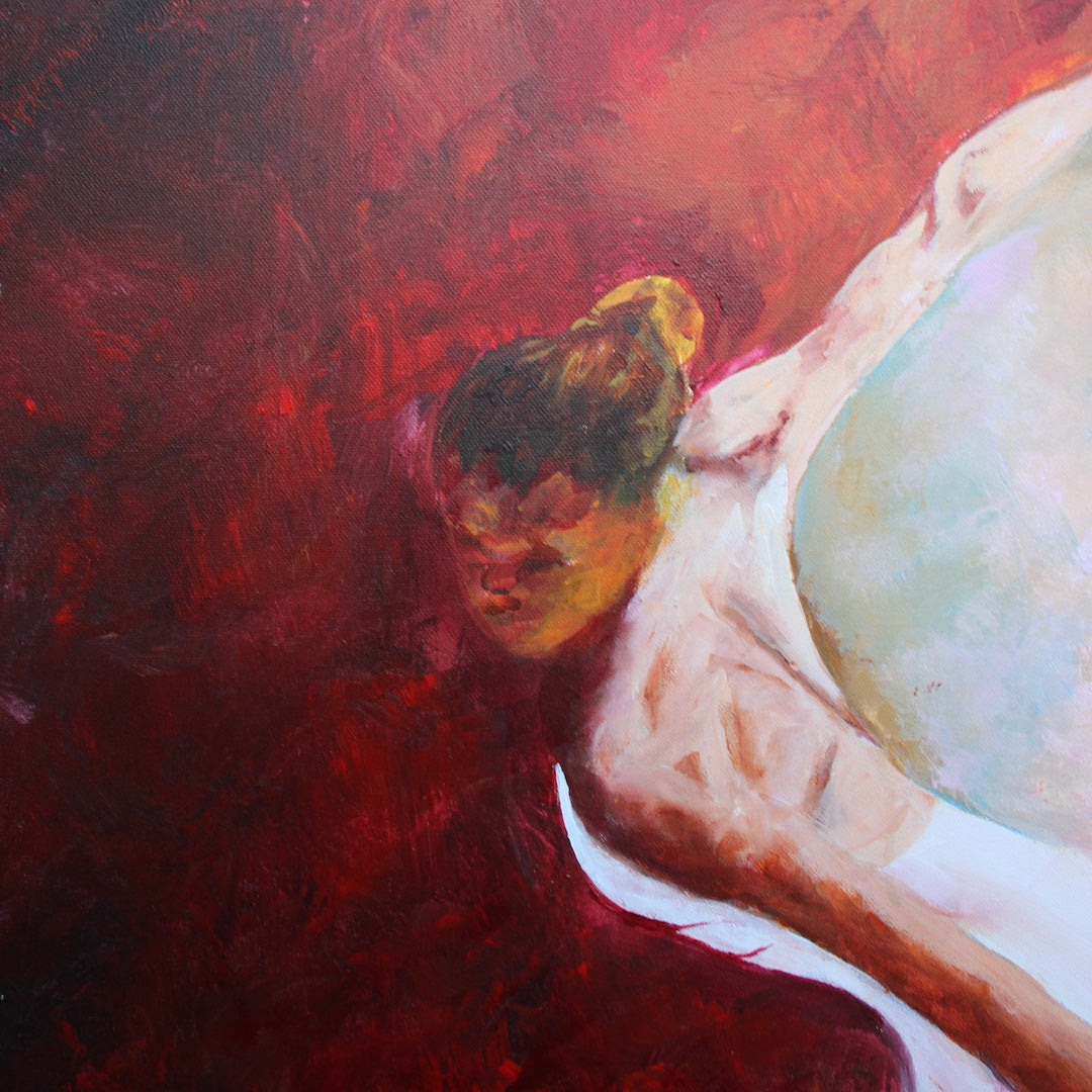 Edge of Release captures the tension between opposing forces: light and shadow, restraint and desire, silence and eruption. The divide across the canvas reflects an internal threshold and a place where grace holds, even as pressure builds.