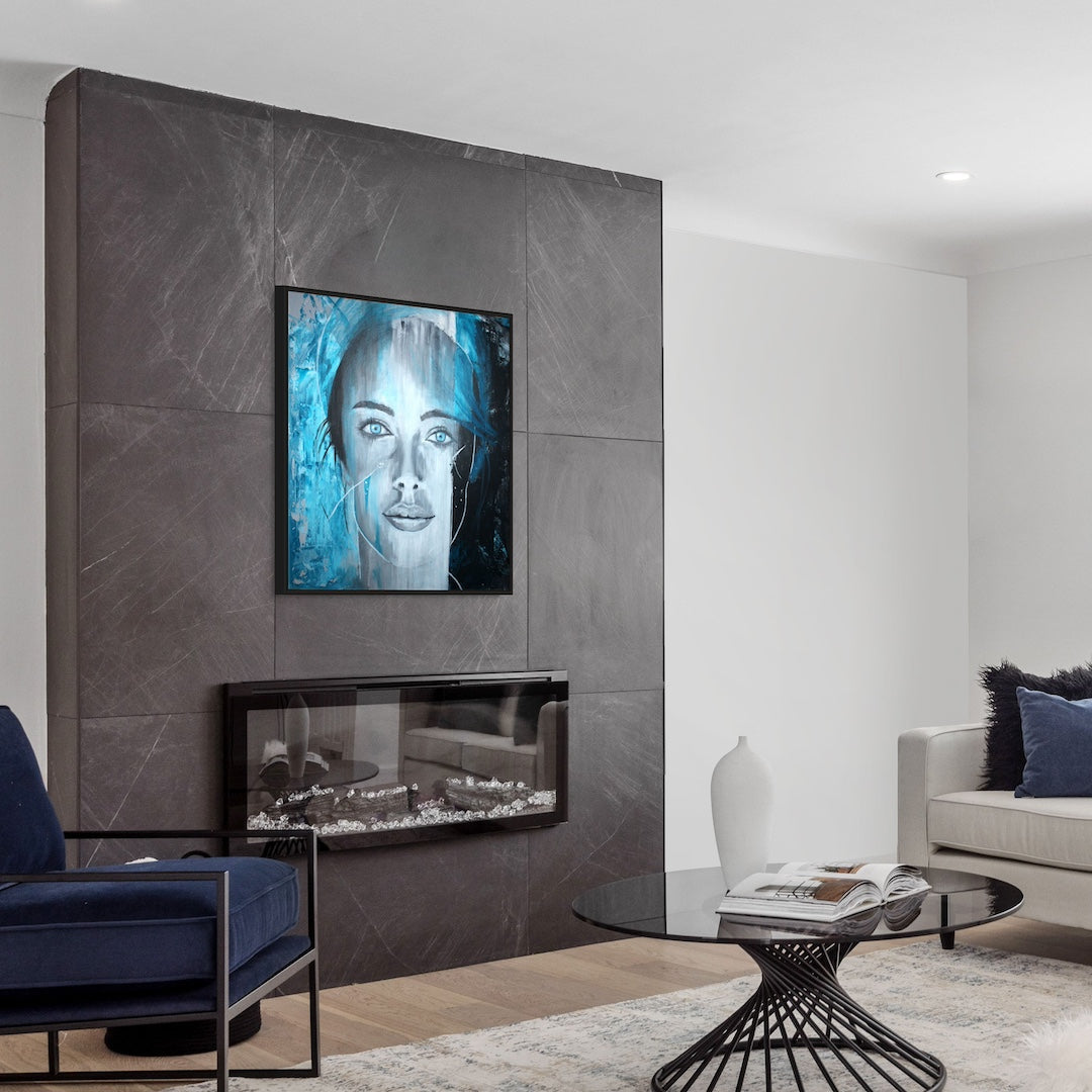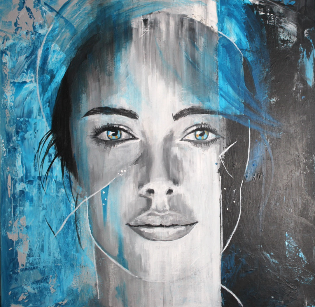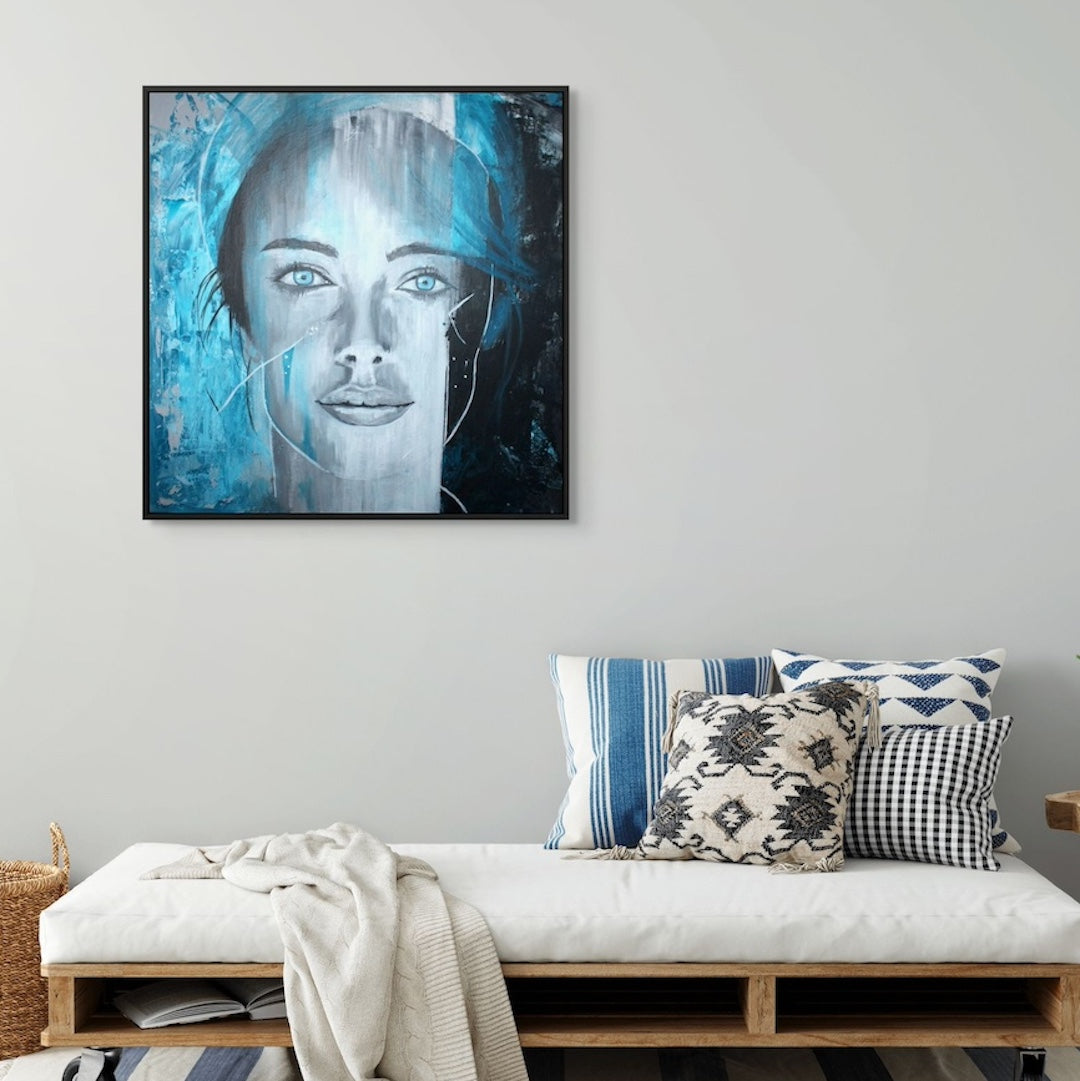 Luminous Allure captures an ethereal presence. Painted in moody blues and blacks, her face shines as if lit from within. Is she seeing you, or searching for something beyond your gaze?