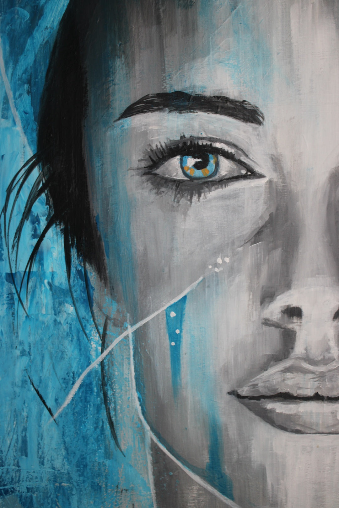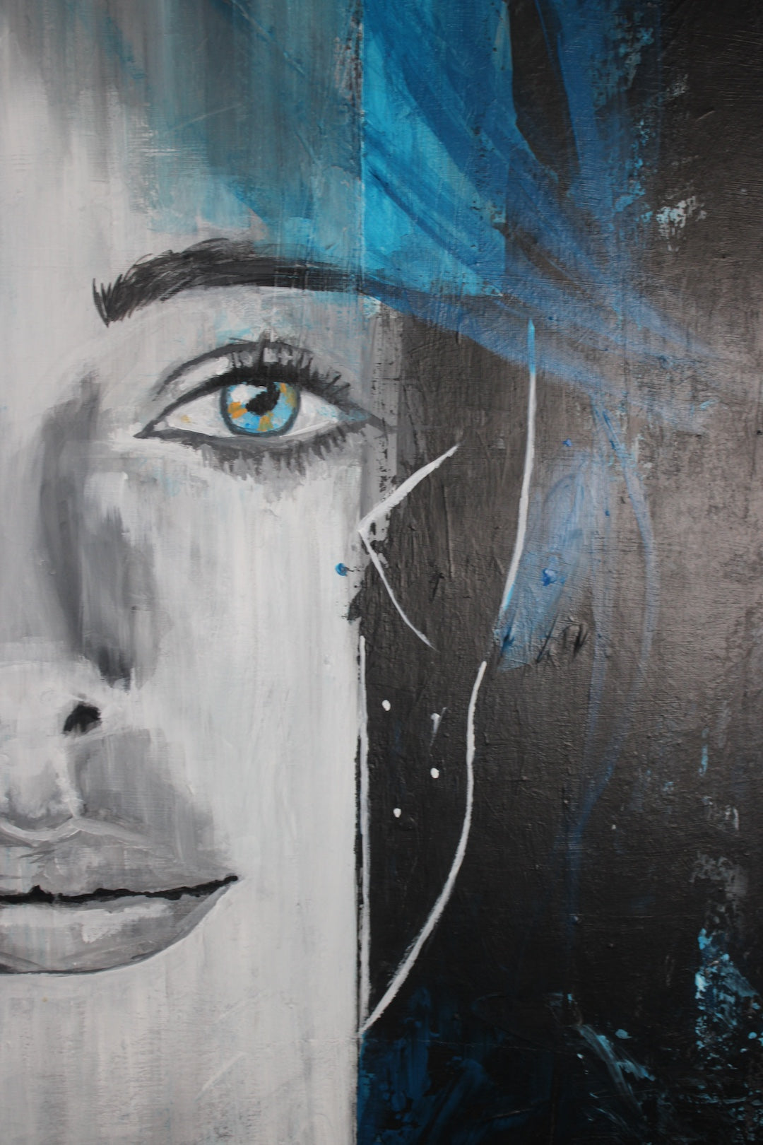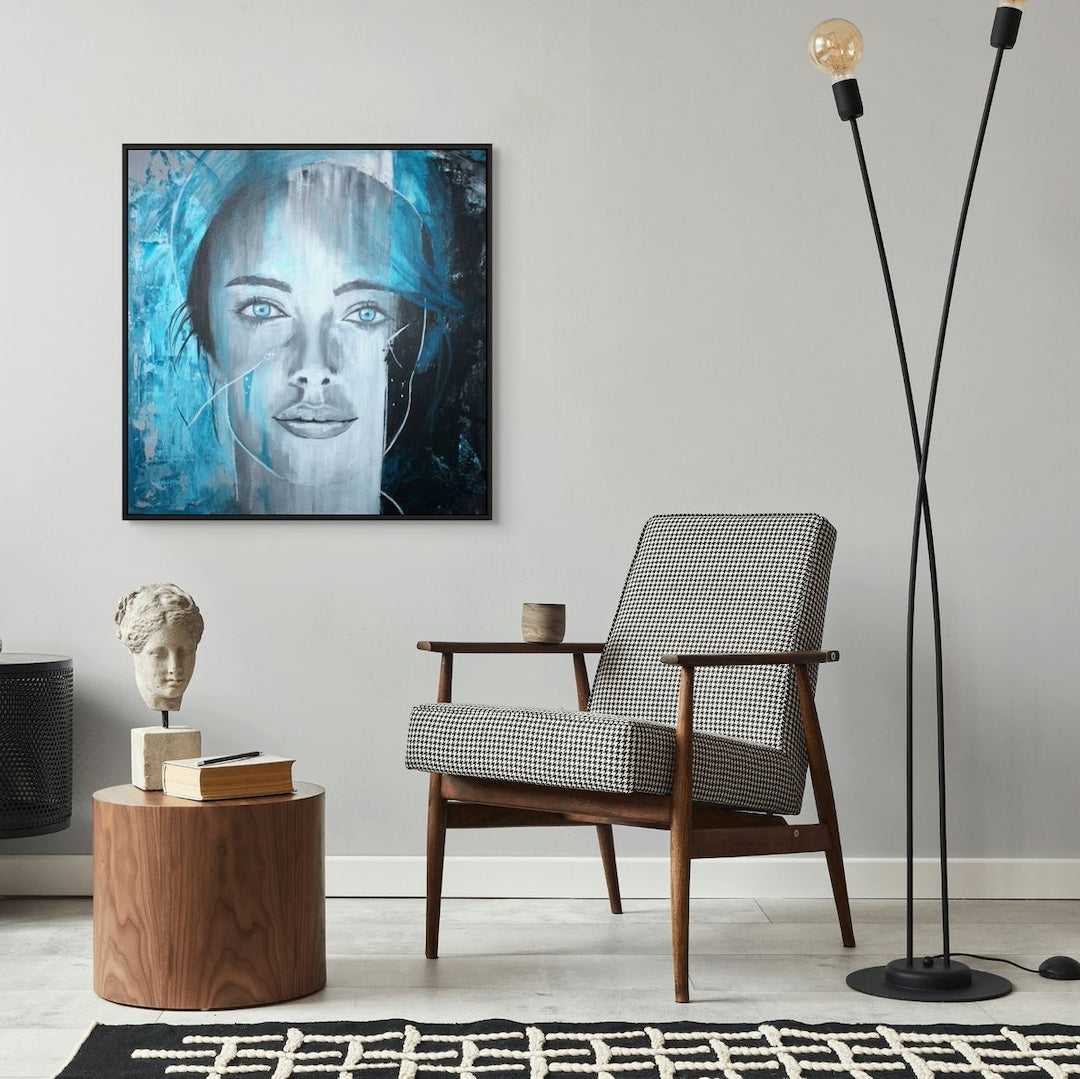 Luminous Allure captures an ethereal presence. Painted in moody blues and blacks, her face shines as if lit from within. Is she seeing you, or searching for something beyond your gaze?