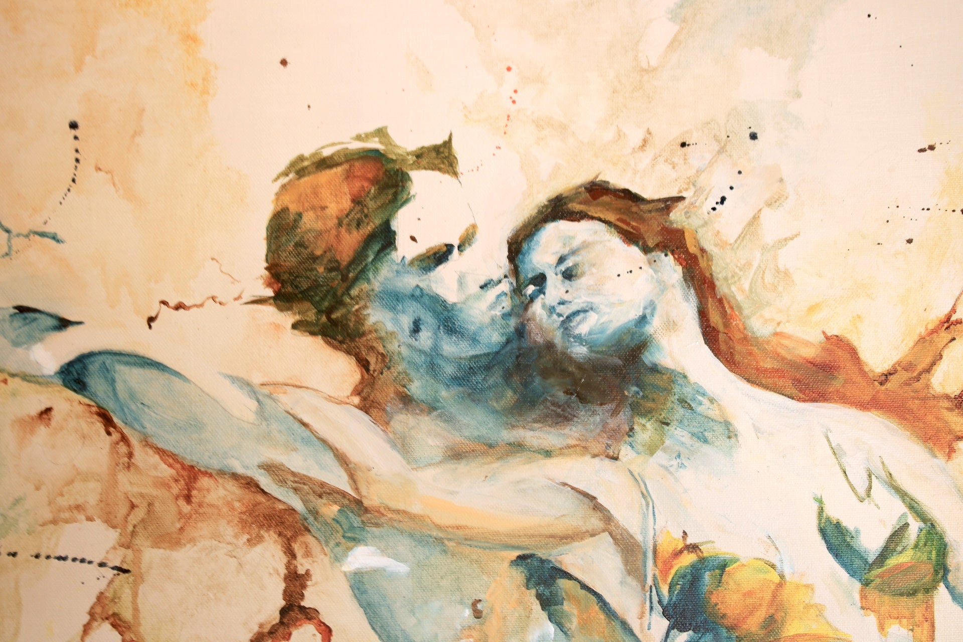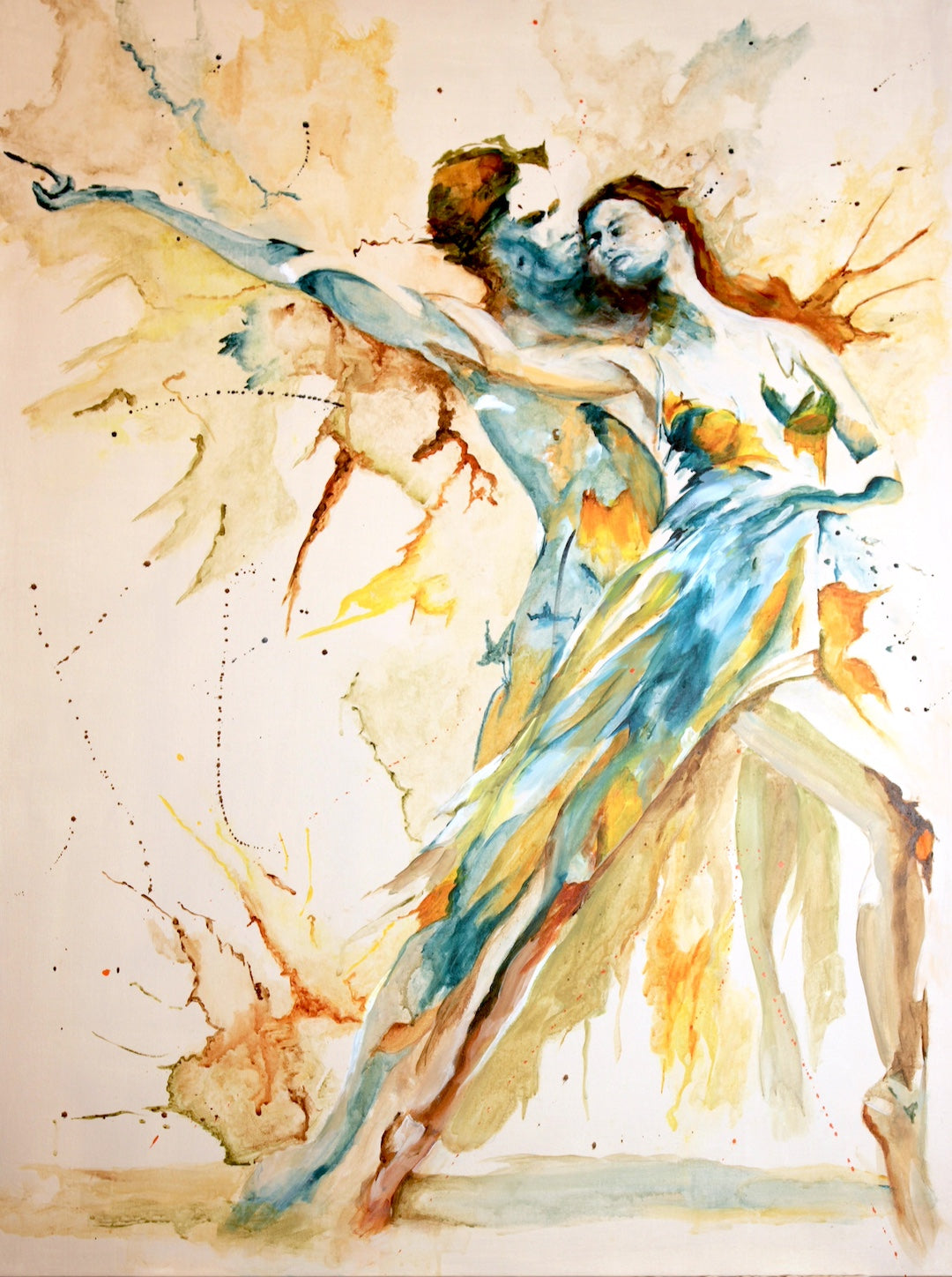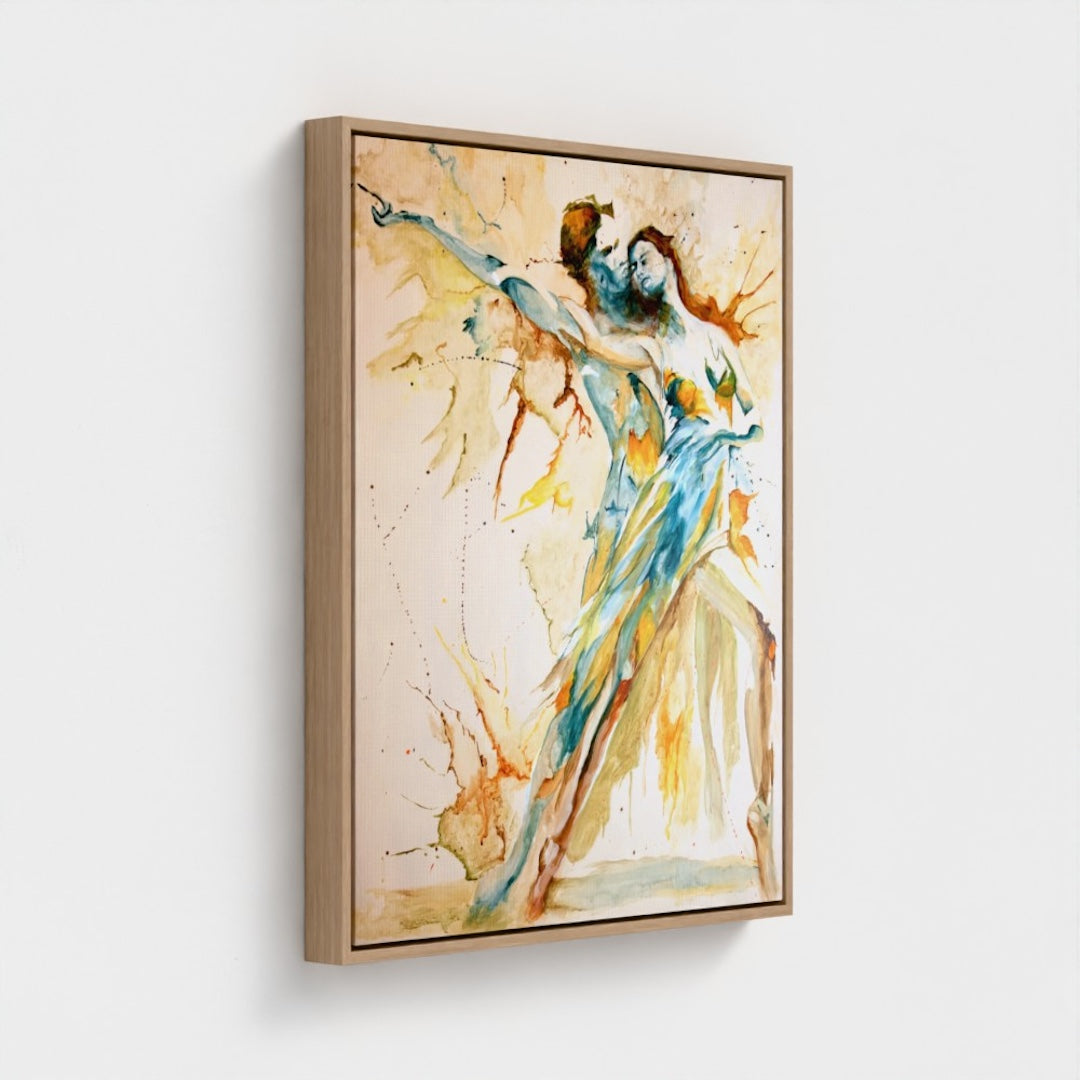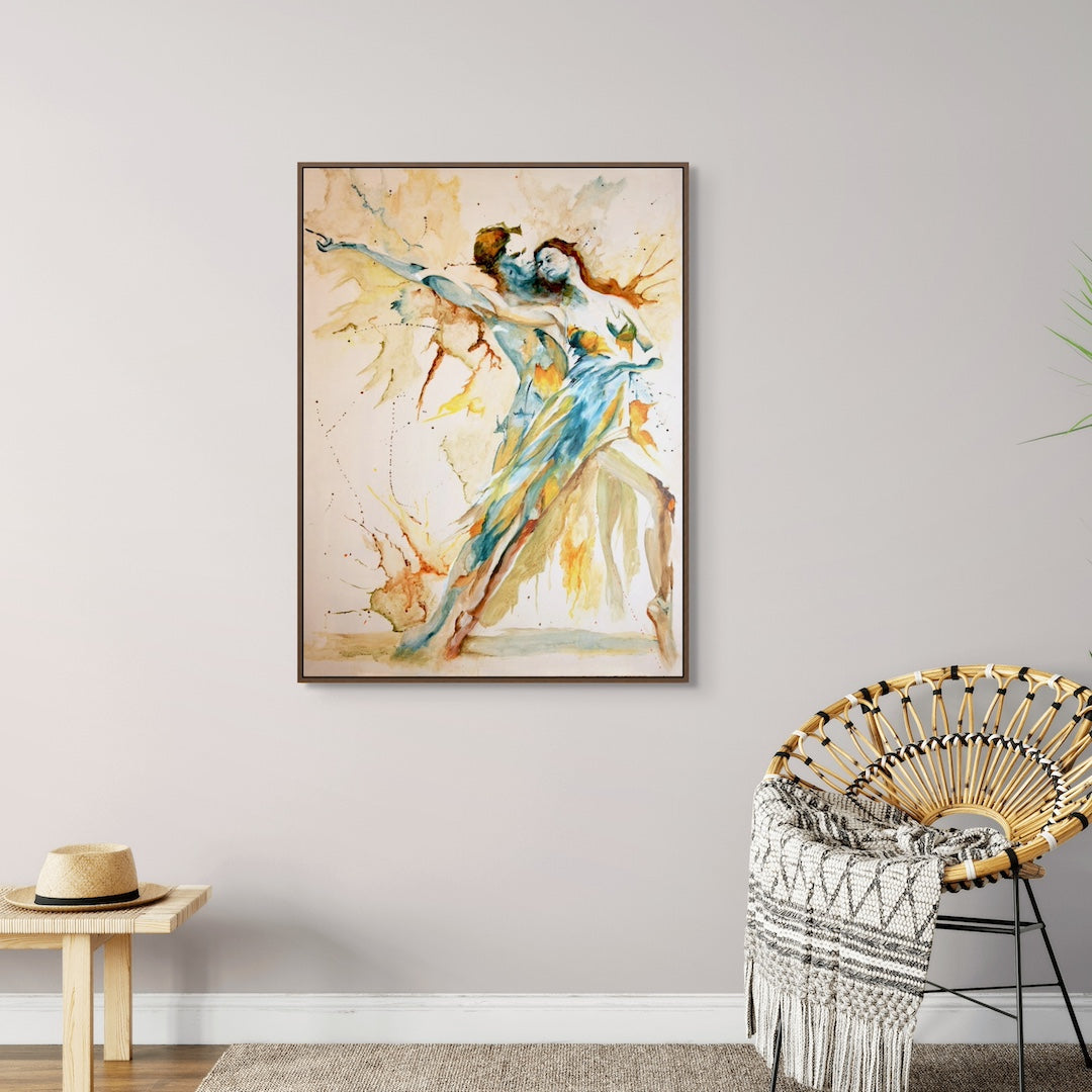 Shatter the Stillness captures the instant where motion breaks free from quiet. The dancers are caught mid-breath, not frozen, but alive with rhythm and light. Colour spills like sound, and what begins as form dissolves into pure feeling. It’s a painting that moves, even in stillness.