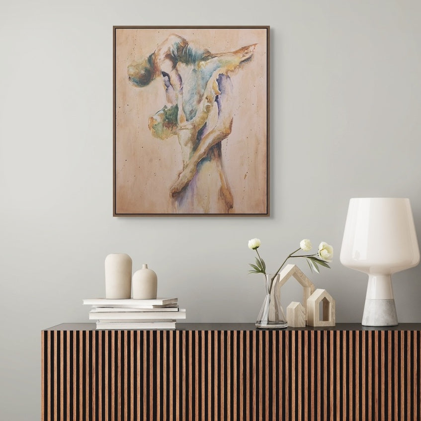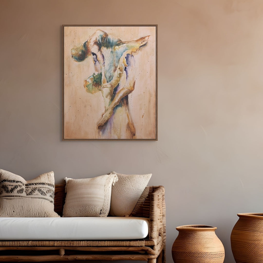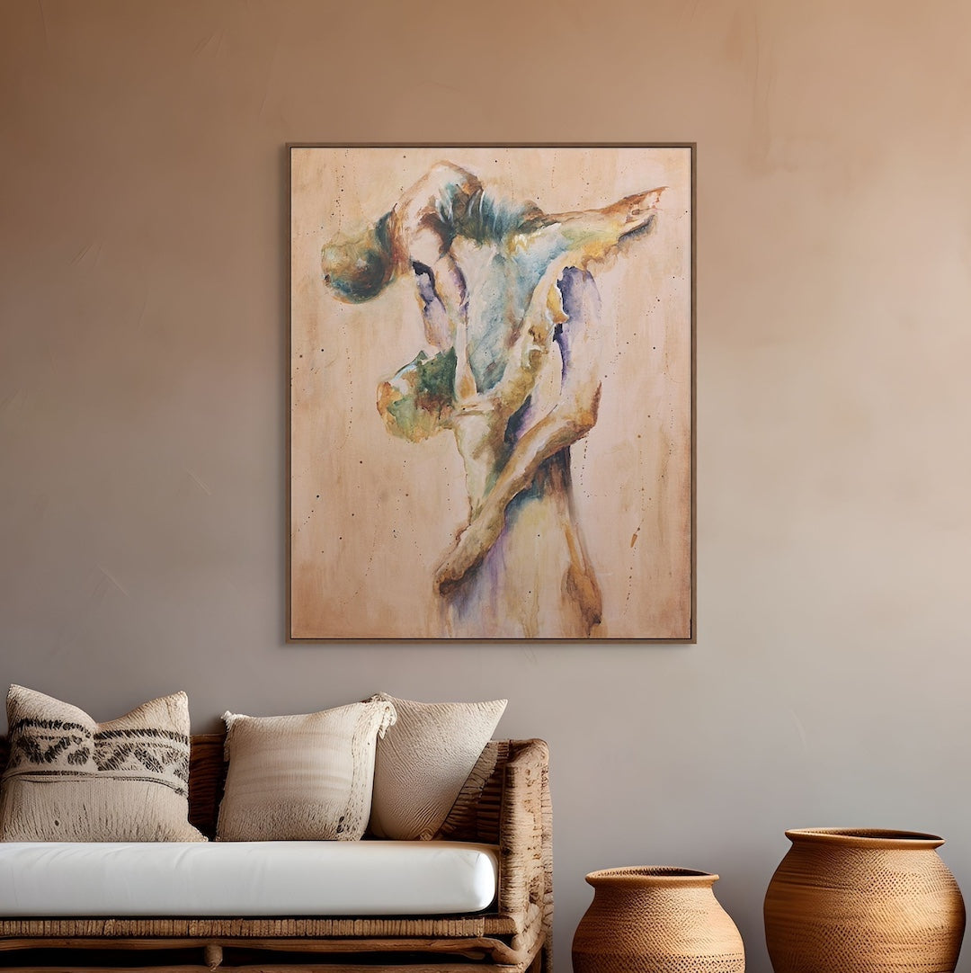 Weightless Embrace embodies the movement and emotion I’ve been searching for in this collection. Painting more loosely, more expressively, hasn’t been an easy transition however here I found what I’d been imagining: a couple in motion, suspended in a moment of power and vulnerability. This is the piece where the journey truly gained momentum.