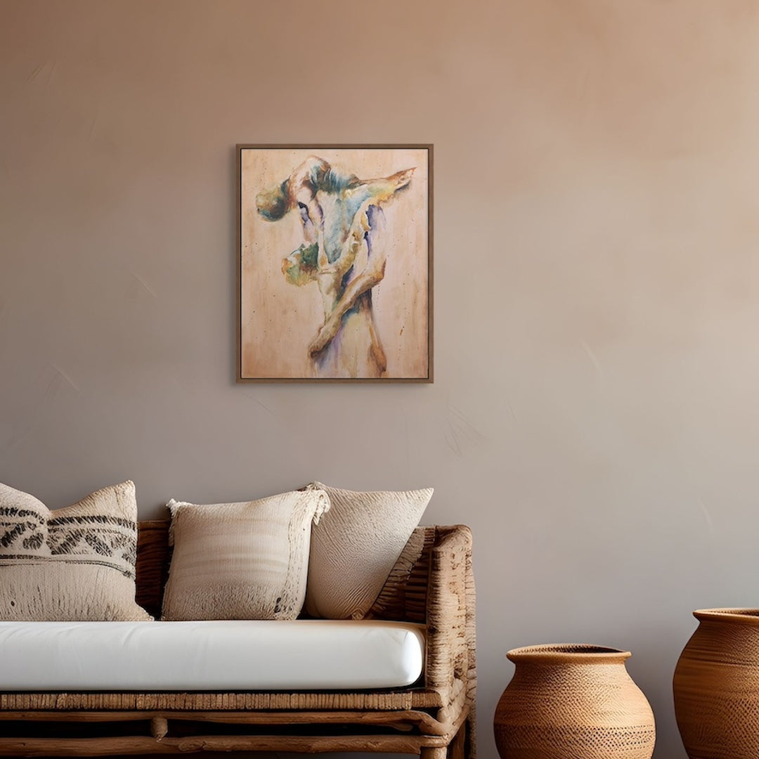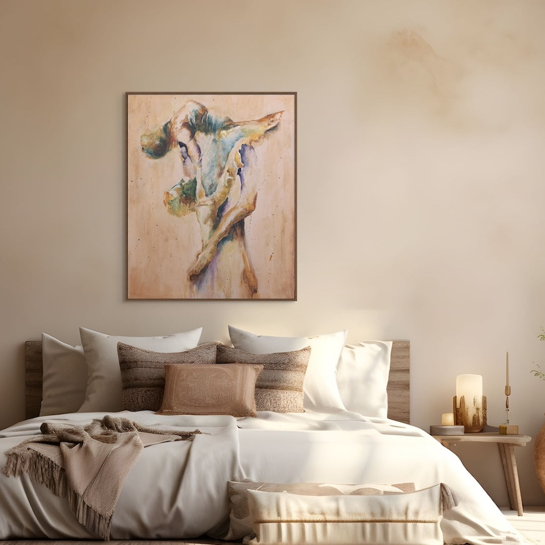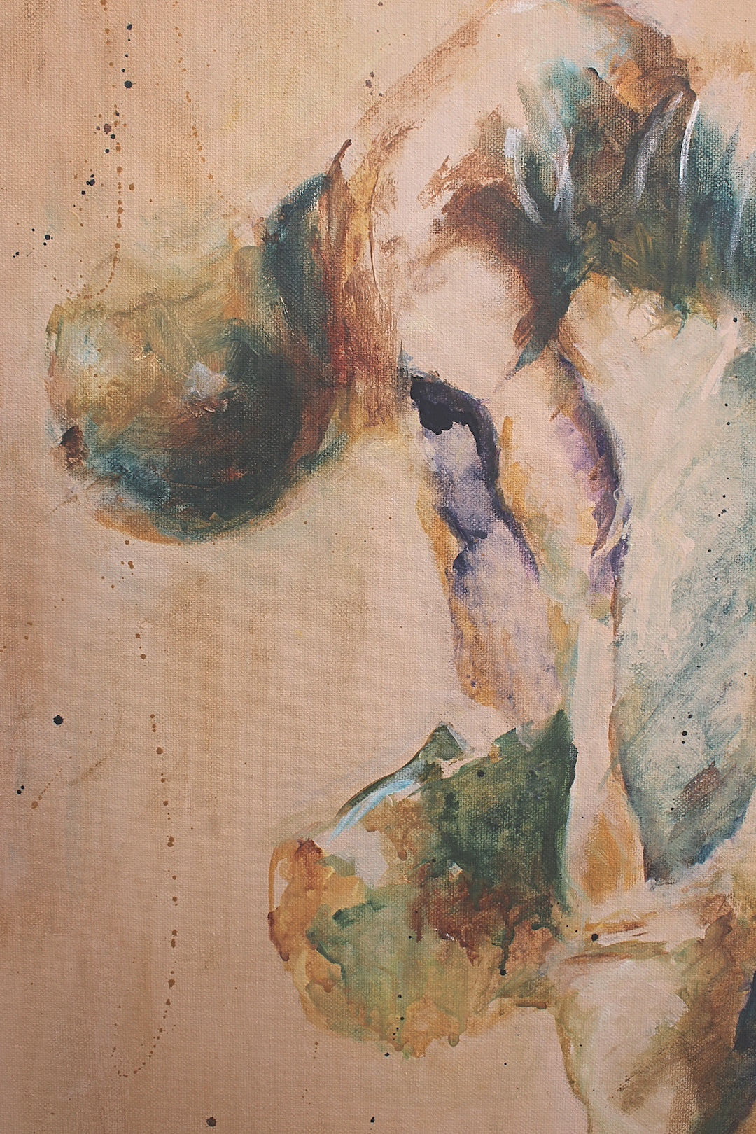 Weightless Embrace embodies the movement and emotion I’ve been searching for in this collection. Painting more loosely, more expressively, hasn’t been an easy transition however here I found what I’d been imagining: a couple in motion, suspended in a moment of power and vulnerability. This is the piece where the journey truly gained momentum.
