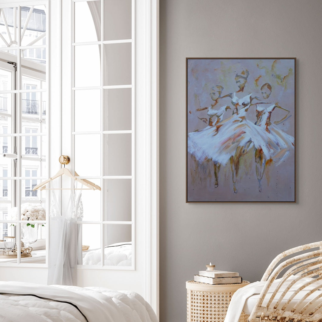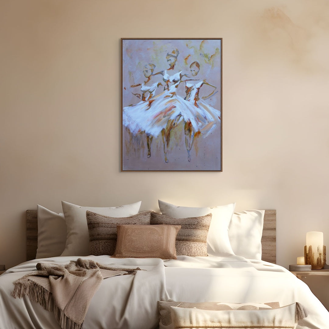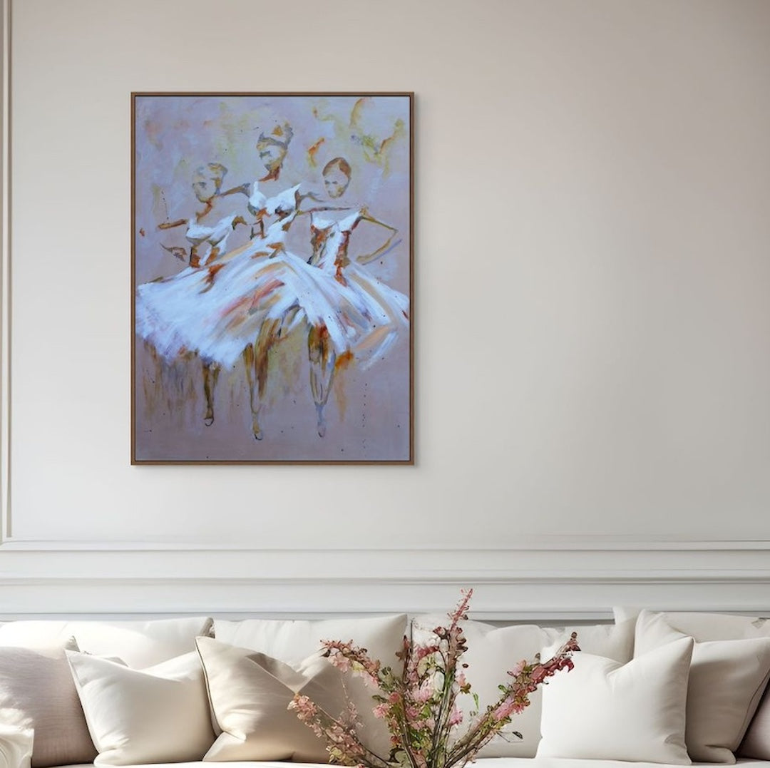 Tres Ballerine traces the shared heartbeat of three ballerinas moving as one. Loose brushwork, soft edges and earthy tones blend into a composition that feels both spontaneous and deeply intentional.