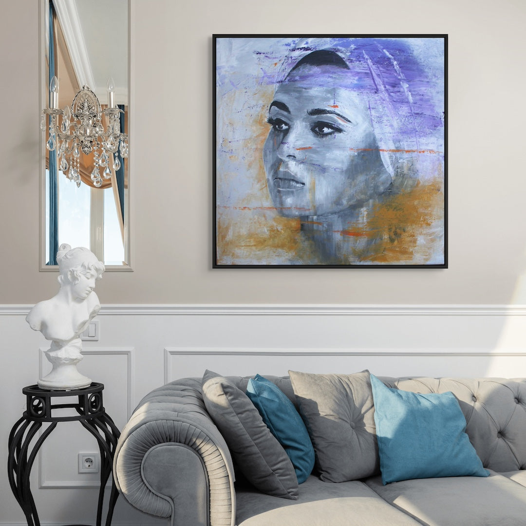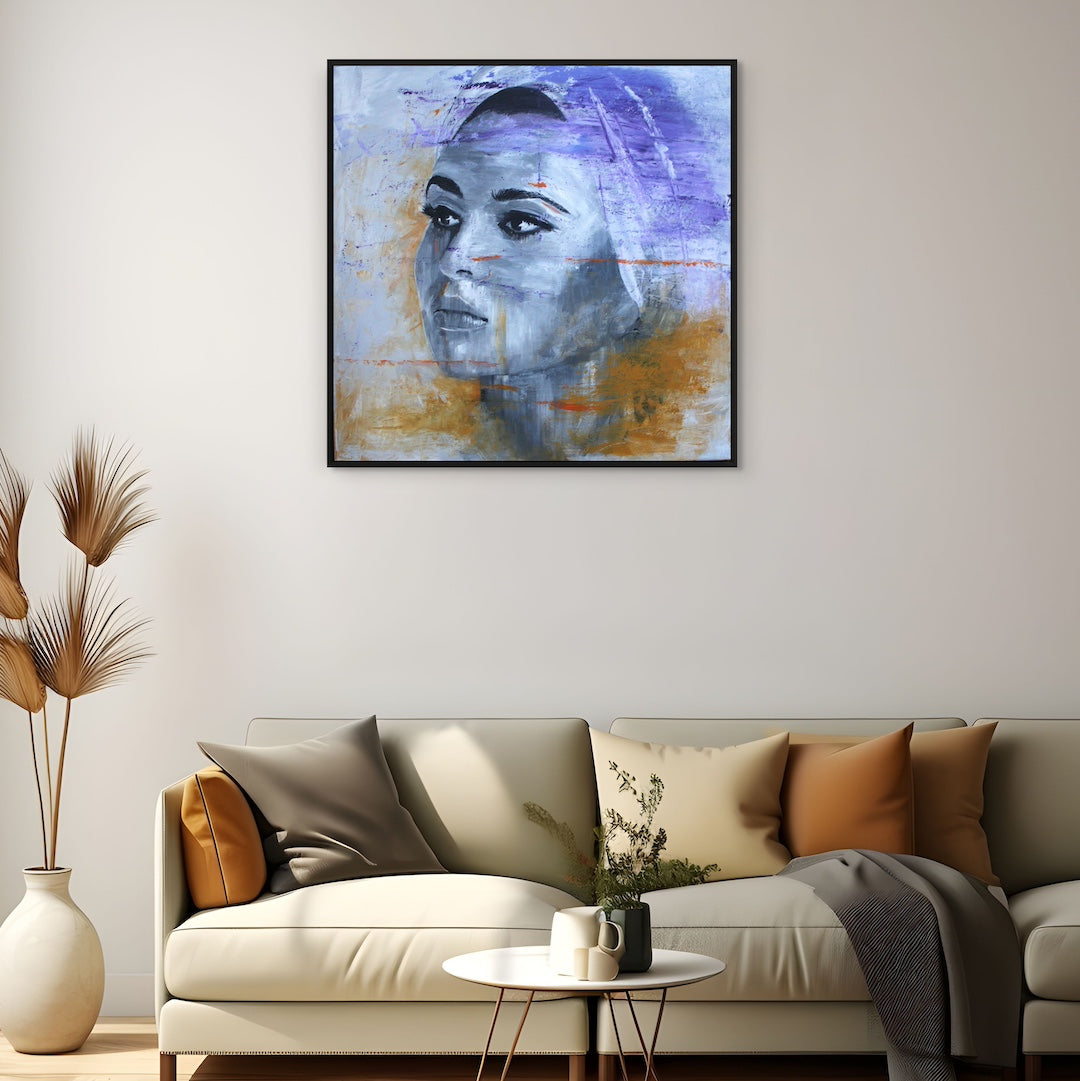When I painted this portrait, I wanted to capture the feeling of someone lost in thought, present with you, but also far away in a place only they know. Her expression holds both softness and weight, a beauty shaped by emotion. I imagine this piece bringing a sense of depth and quiet mystery into any space it belongs.