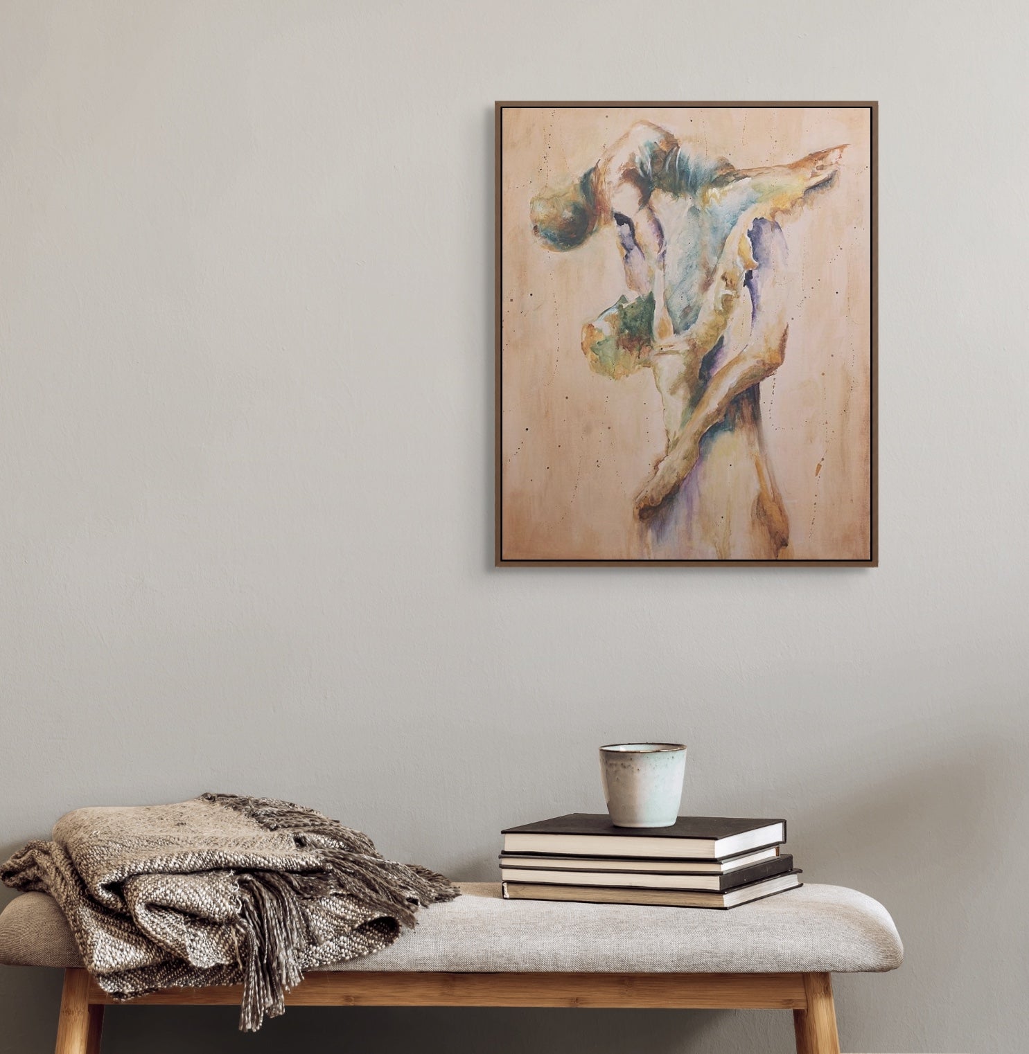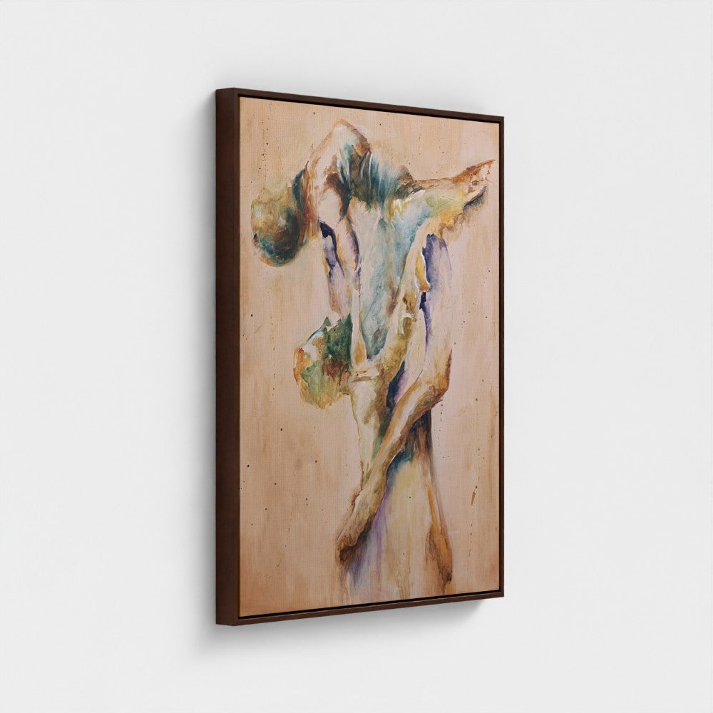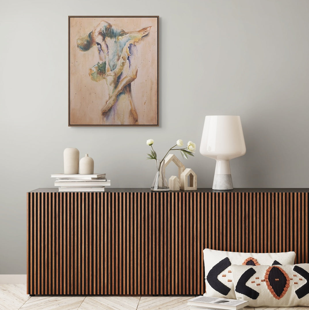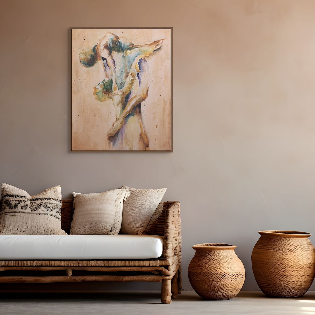Weightless Embrace embodies the movement and emotion I’ve been searching for in this collection. Painting more loosely, more expressively, hasn’t been an easy transition however here I found what I’d been imagining: a couple in motion, suspended in a moment of power and vulnerability. This is the piece where the journey truly gained momentum.