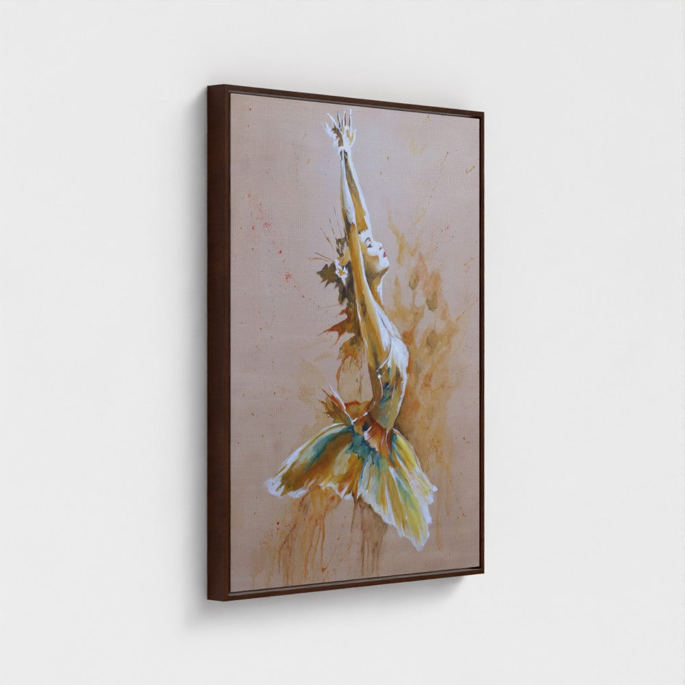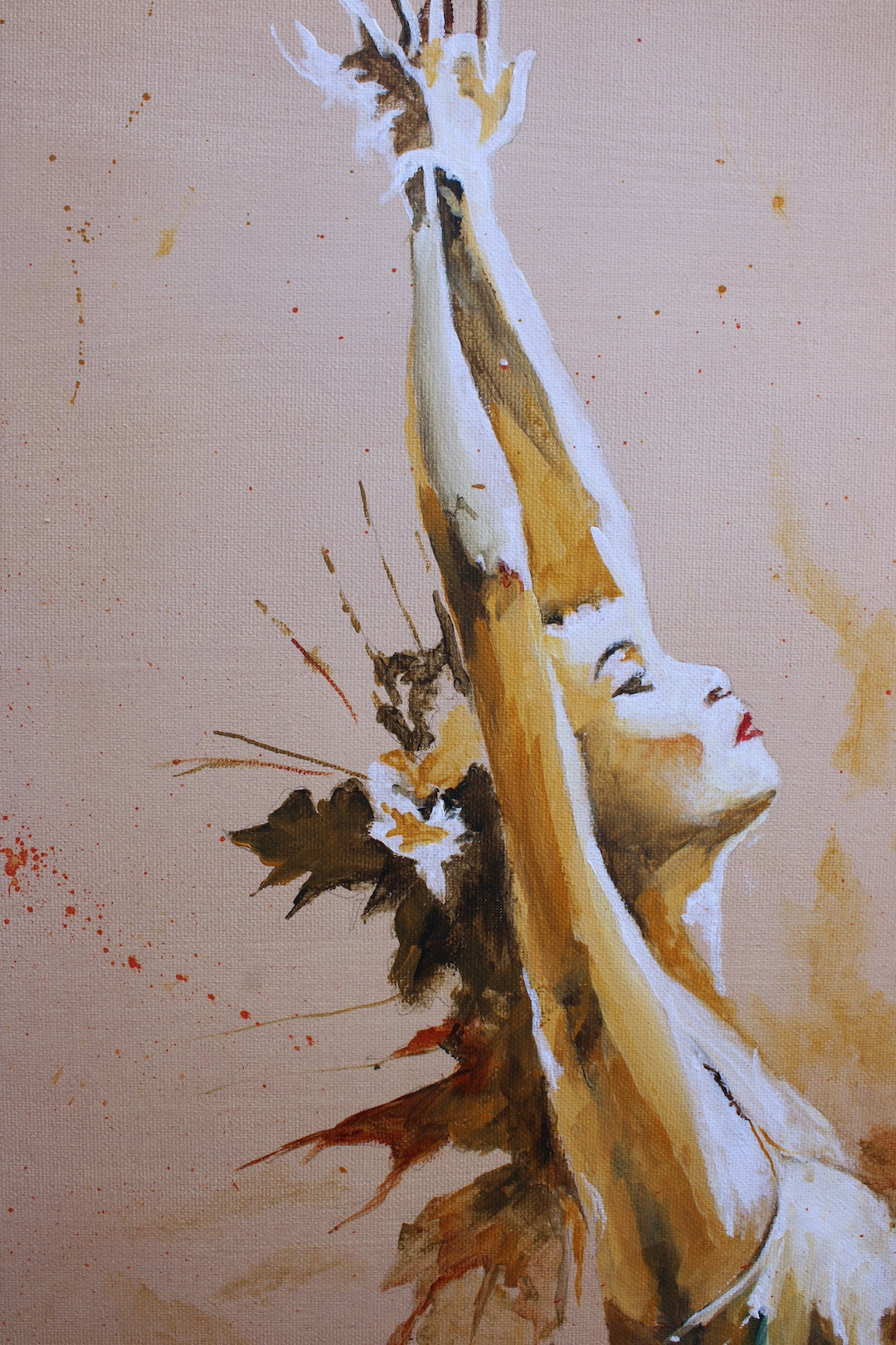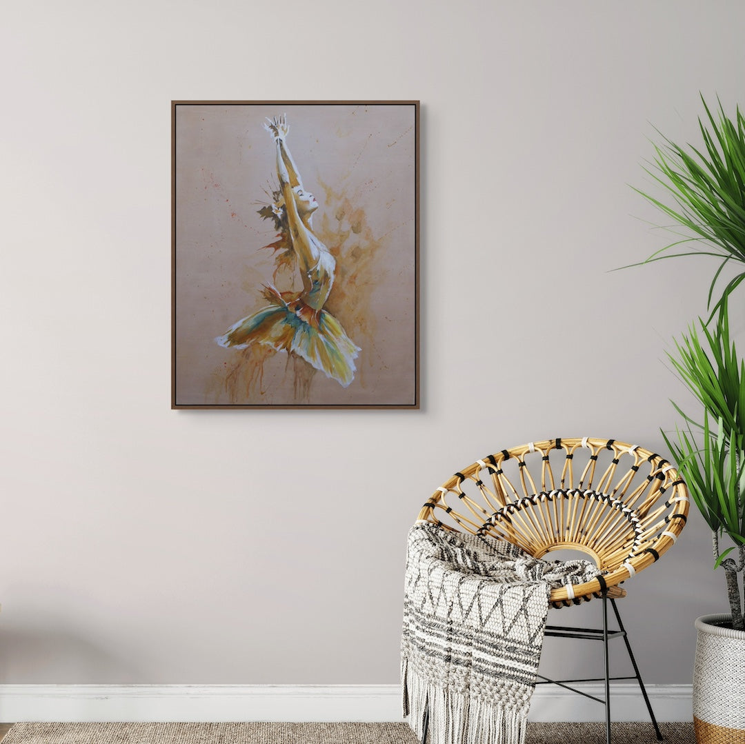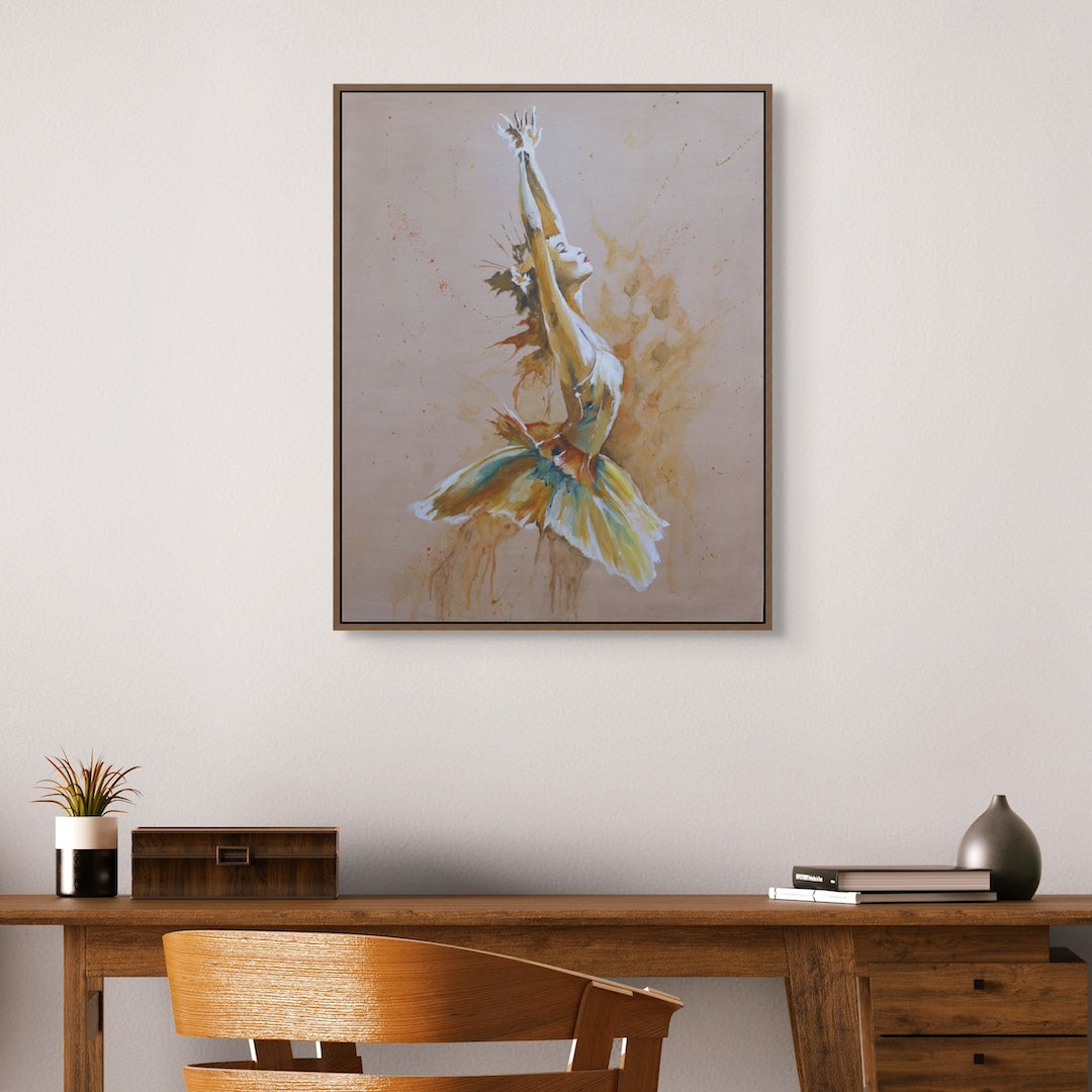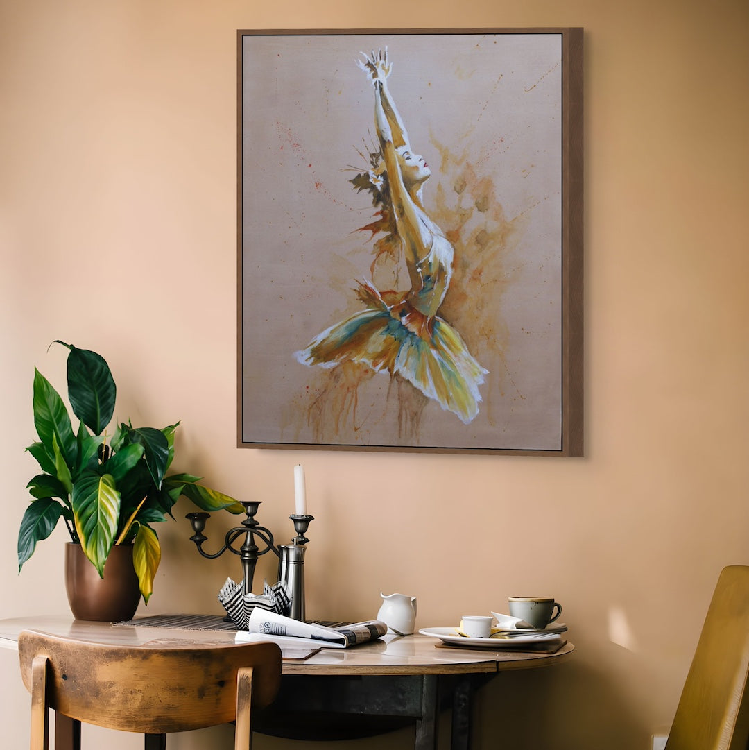 When I created this piece, I wanted to paint the kind of freedom we all crave, the moment you let go and let the music carry you. Her golden dress became my way of painting sunlight, as though even the air joined in her dance. I imagine this piece bringing that same warmth and light into any space it hangs.